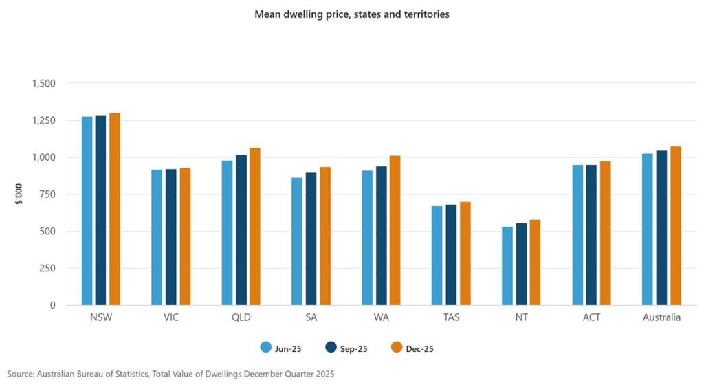 In the December quarter 2025, the total value of residential dwellings rose in all states and territories, with growth most evident in Queensland (5.3 per cent), Western Australia (7.8 per cent), and New South Wales (1.7 per cent).