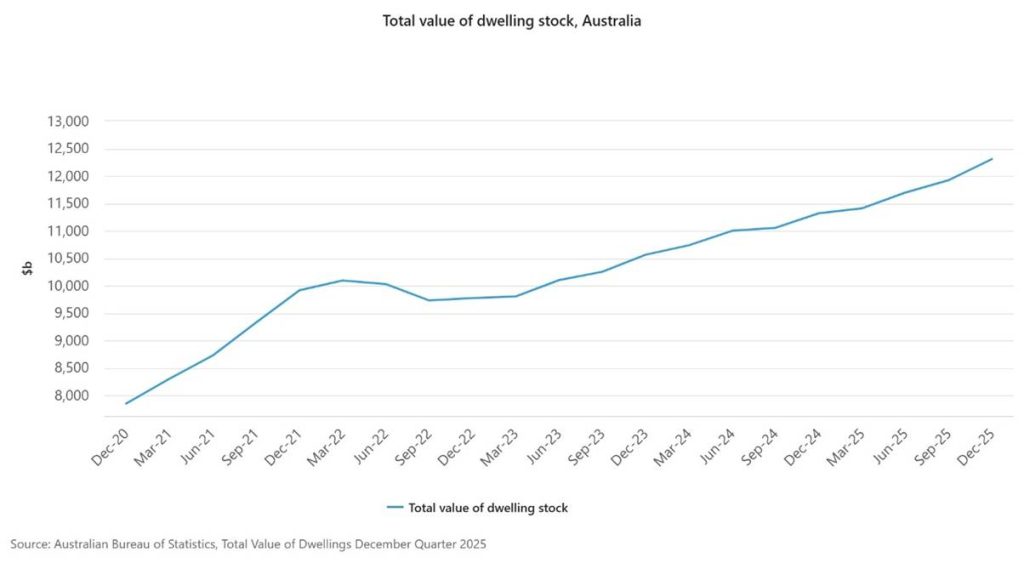The total value of residential dwellings in Australia is now $12,307.2 billion according to the Australian Bureau of Statistics (ABS).