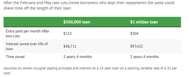 The next move for rates is down and home-owners could shave over two years off a 25-year-mortgage if they keep their repayments the same as before the February and May interest rate cuts.